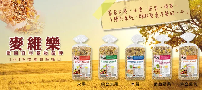 風行世界87個國家的德國百年老牌,採用最天然的原料包含各式穀類小麥、大麥、燕麥及裸麥,混以各種高營養價值的雜糧、堅果及水果乾而成的各式Museli果麥片,