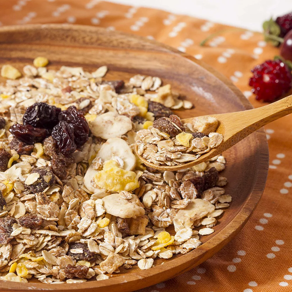 穀片-(小麥、燕麥、大麥、裸麥;水果乾[無籽白葡萄乾、香蕉脆片(香蕉乾、椰子油、糖、蜂蜜、天然香料)、 蘋果片、杏桃、草莓乾]、玉米脆片(玉蜀黍、糖、鹽、麥芽萃取)、葵花仁、檸檬酸、鹽 本產品可能含有果核和果殼屑片,食用時請小心