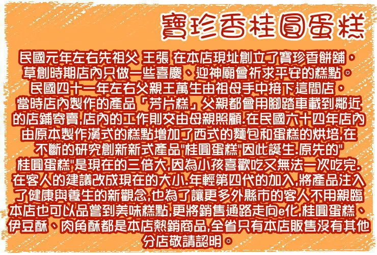 寶珍香餅店創立於民國元年至今,為『桂圓蛋糕』創始店,四代精湛手藝傳承,口感細膩、紮實充份展現餅藝最高境界。
